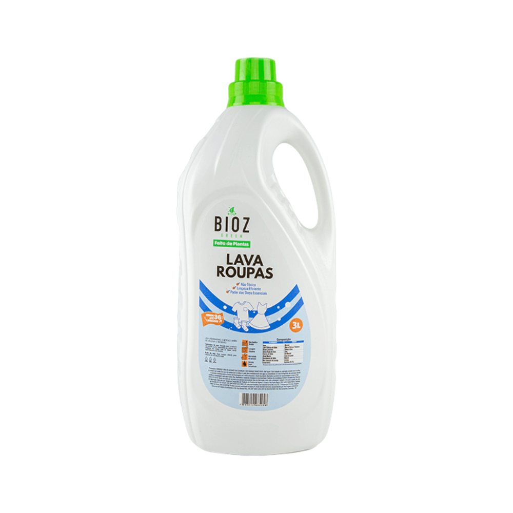 Produzido com ingredientes de origem vegetal, o Lava Roupas Bioz Green não agride a pele nem o meio ambiente. Livre de cloro, corantes, branqueadores ópticos e fragrâncias sintéticas.